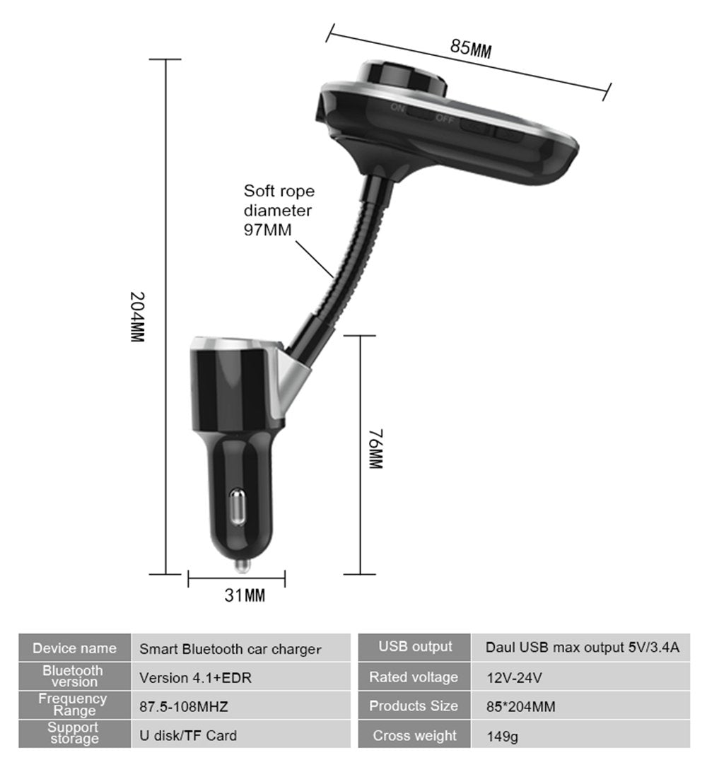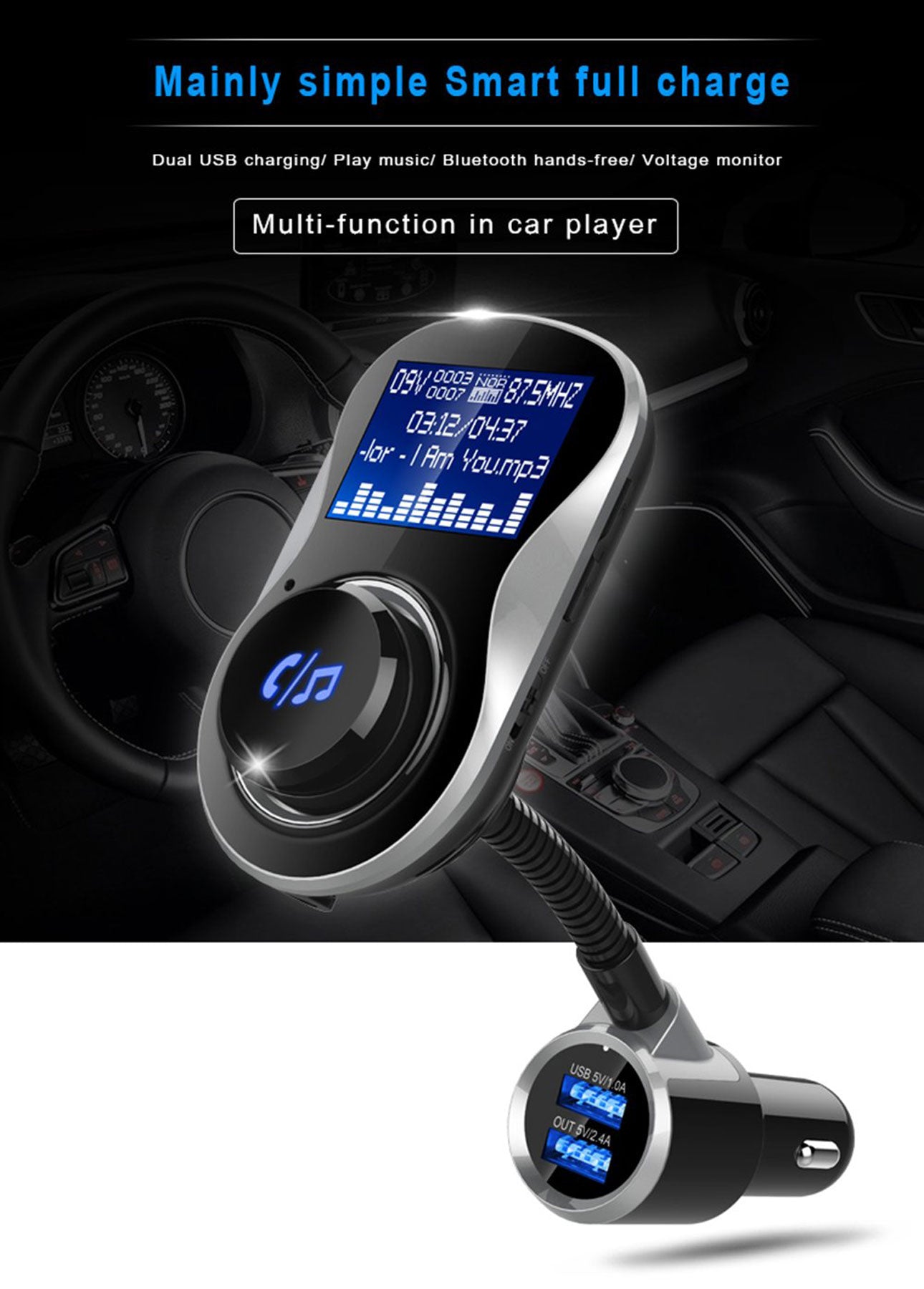 iSunnao FM Bluetooth Transmitter for Car with dual USB Ports Chargers (Max output 5V/3.4A). The LED digital display screen and Built-In Mic give you the safer, flexible, and convenient driving experience of hands-free calling, music enjoyment, quick charge.
